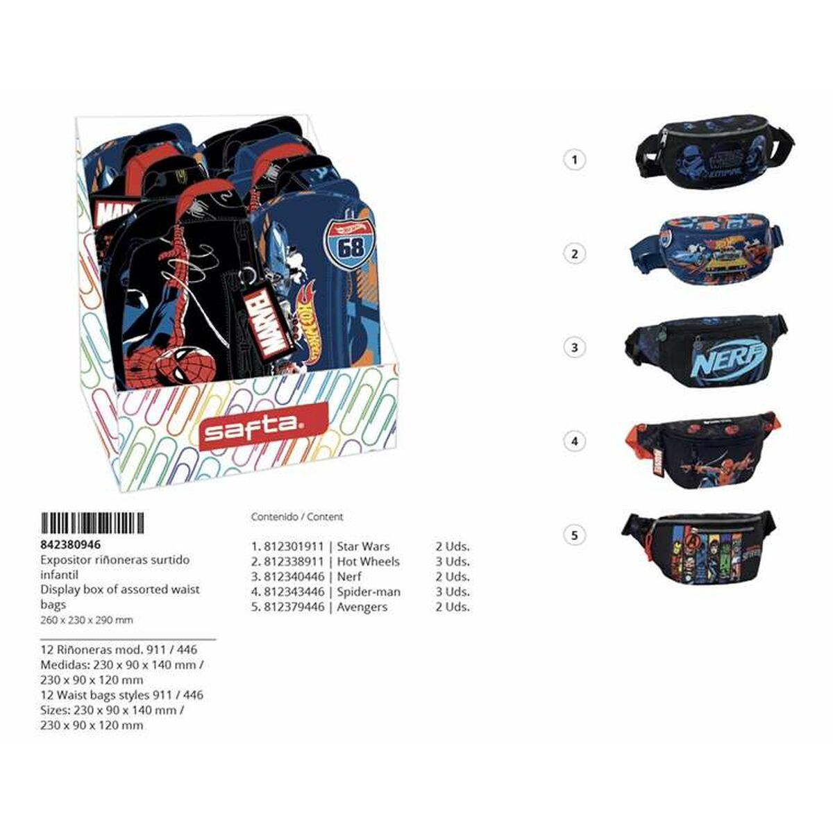 The Safta children’s waist bag is a practical and functional accessory specially designed for little ones, with a unisex style suitable for any boy or girl. It features a multicolor design that adds variety and energy, ideal for matching different children’s styles and preferences, and is delivered in assorted designs sent randomly according to stock, adding an element of surprise and exclusivity to each piece. Made for comfort and ease of use, its approximate dimensions of 26 x 29 x 23 cm offer a suitable size for kids to carry their essential personal items without being bulky or heavy. Its composition and manufacturing ensure a durable yet lightweight piece, facilitating adjustment and transport during daily activities, outings, or school trips. This waist bag is specifically designed for children, combining age-appropriate features such as accessible pockets and secure closures with an attractive, colorful look that encourages kids’ interest and independence in organizing their belongings. Its unisex and versatile design makes it a practical solution for light carrying, promoting habits of order and proper mobility from an early age. In summary, this Safta children’s waist bag combines functionality, size, and child-focused design, making it an essential accessory for their daily activities.