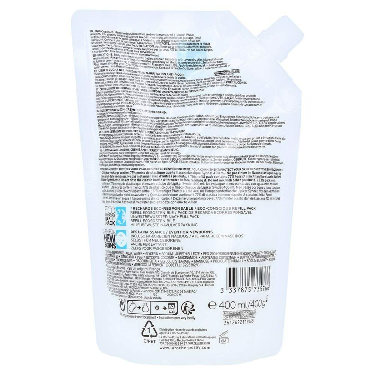 The Lipikar Syndet AP+ cleansing cream from La Roche-Posay is a product specially formulated for the daily hygiene of all skin types, including the most sensitive and atopic, requiring a gentle cleansing that respects the skin barrier. It features a gel-cream texture that provides effective cleansing without causing irritation or drying the skin, thanks to its formula enriched with ingredients such as Polysorbate 20, a mild surfactant, and safe preservatives like Sodium benzoate and Sodium chloride that ensure its stability and preservation. This product comes in a 400 ml refill format, reflecting its commitment to sustainability through eco-friendly packaging that reduces environmental impact by limiting plastic use. Its white color and creamy texture make application pleasant, providing a comfortable feeling after washing. Formulated and manufactured in France, it meets European standards for high dermatological quality. The Lipikar Syndet AP+ cleansing cream does not contain sunscreen, making it suitable for face and body cleansing without interfering with photoprotection routines. It is a recommended option for those seeking a respectful, effective, and sustainable product to care for delicate or atopy-prone skin, maintaining natural hydration and strengthening the skin barrier after each use. Its unisex formula makes it suitable for the whole family and various skin types, consolidating its position as an ally for dermatologically safe and environmentally responsible cleansing.